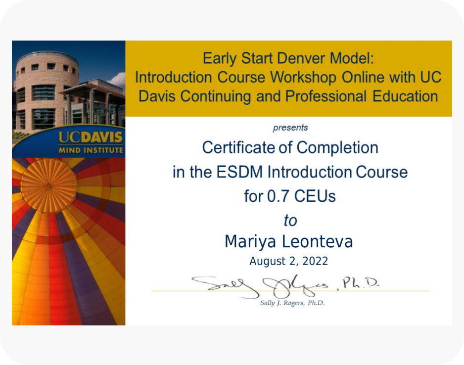 - Окончила курс и является инструктором по применению метода Денверская модель раннего вмешательства (Sally J. Rogers) US Devis California’s college town
