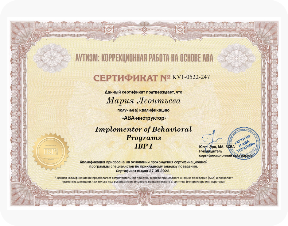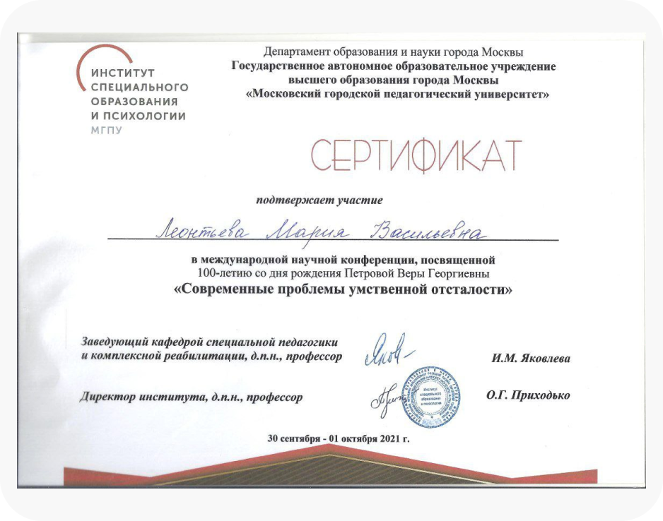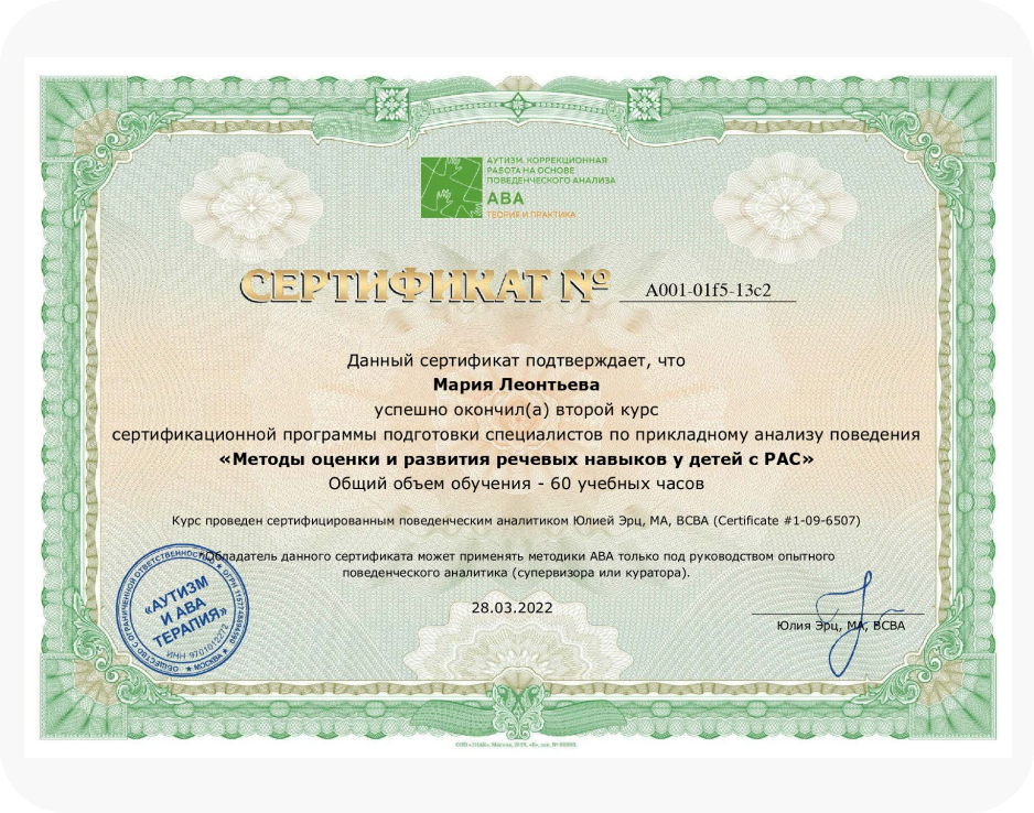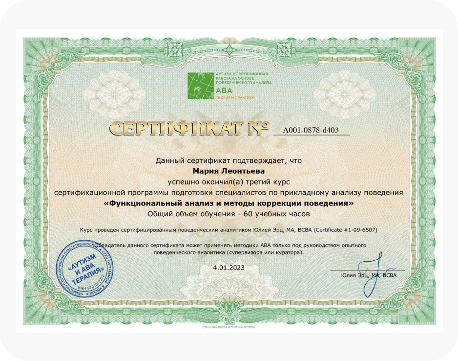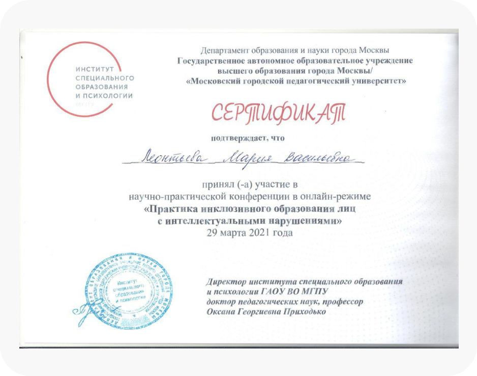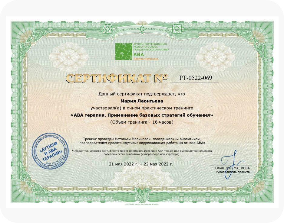 - Курс повышения квалификации МГПУ "Комплексная помощь детям и подросткам с расстройством аутистического спектра