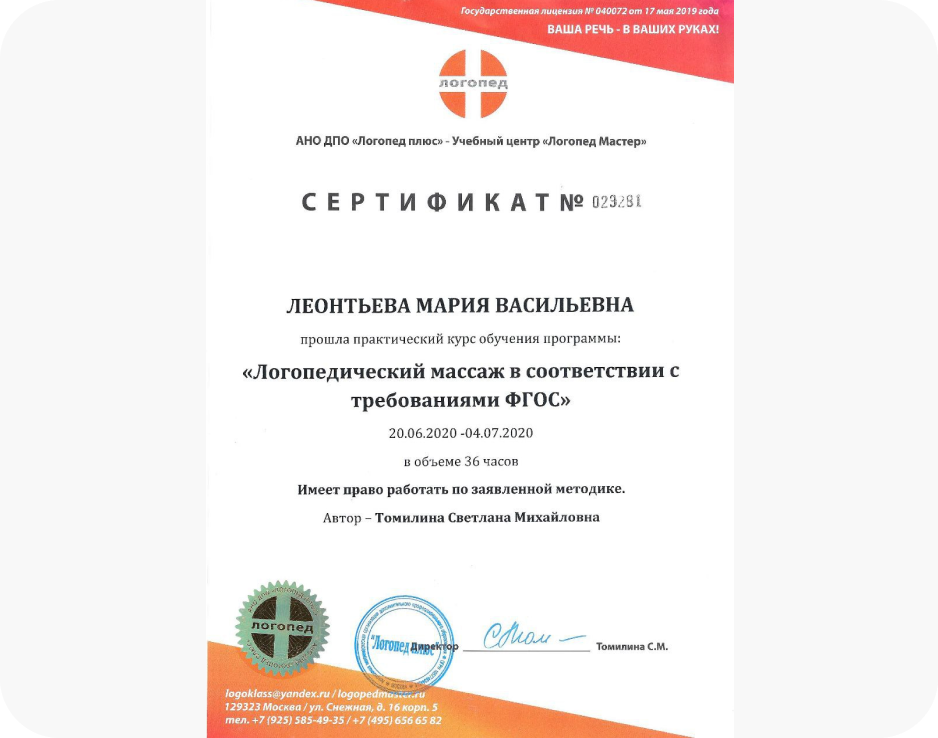 - Курс повышения квалификации АНО ДПО Логопед плюс "Логопедический массаж в соответствии с требованиями ФГОС"
