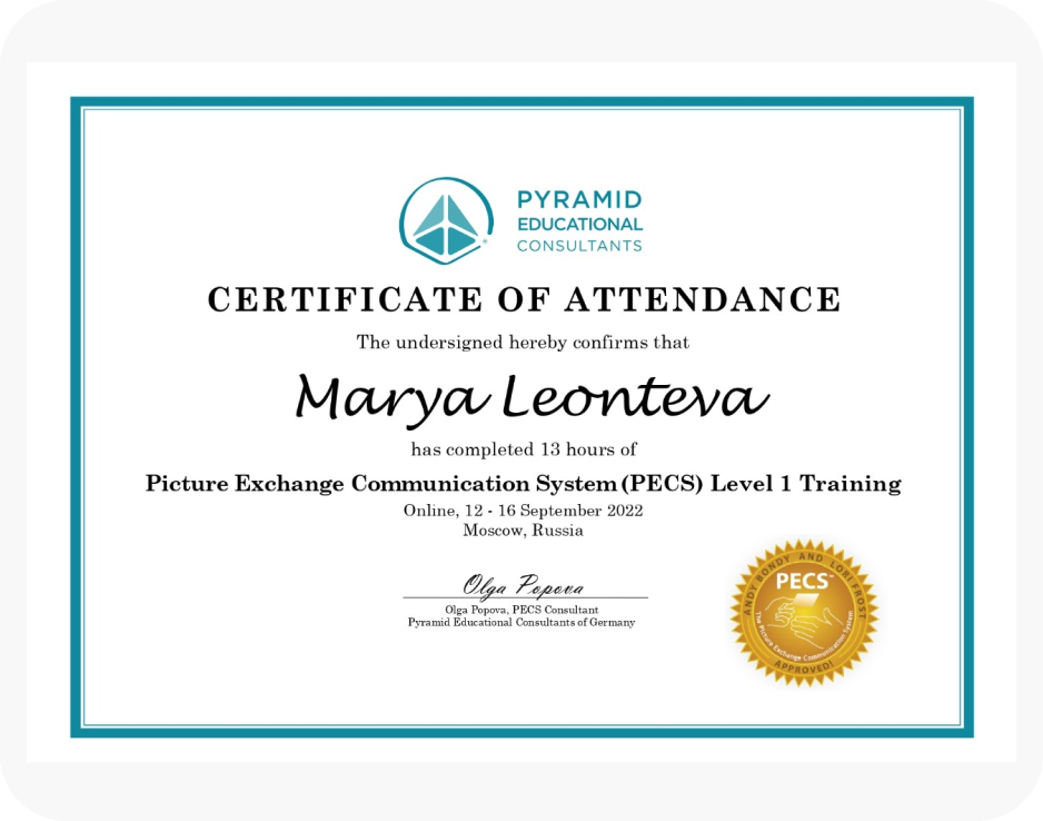 - Курс «Использование системы альтернативной коммуникации PECS» (г. Москва)