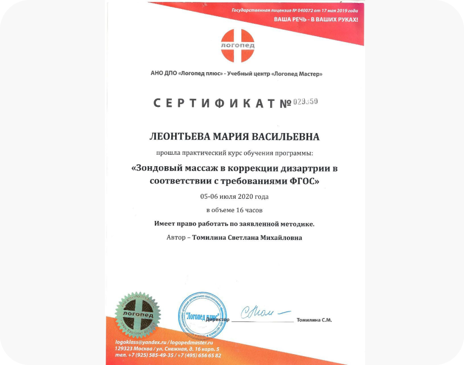 - Курс повышения квалификации АНО ДПО Логопед плюс "Зондовый массаж в коррекции дизартрии в соответствии с требованиями ФГОС"