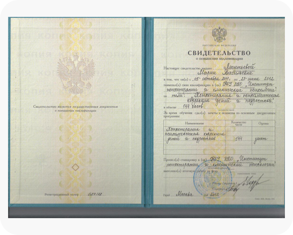 - Курс повышения квалификации НОУ ДПО Институт психотерапии и клинической психологии "Психотерапия и психологическая коррекция детей и подростков" 144 ч