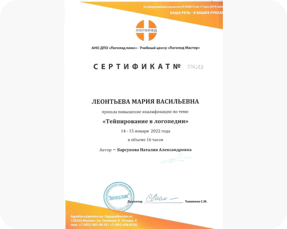 - Курс повышения квалификации АНО ДПО Логопед плюс "Тейпирование в логопедии»