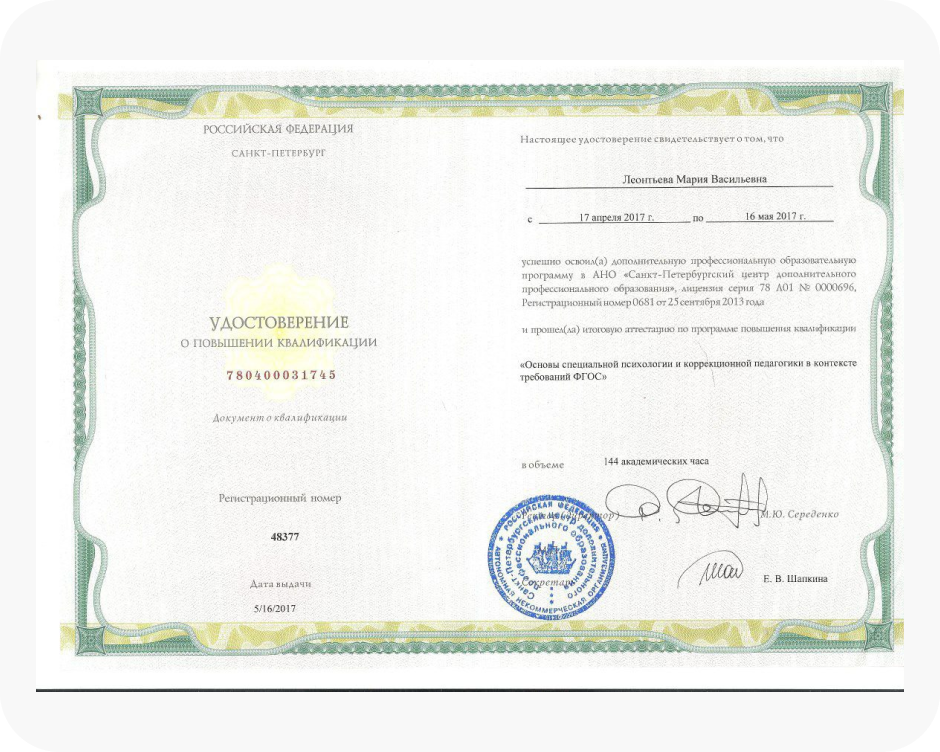 - Курс повышения квалификации АНО Санкт - Петербургский центр дополнительного профессионального образования "Основы специальной психологии и коррекционной педагогики в контексте требований ФГОС"