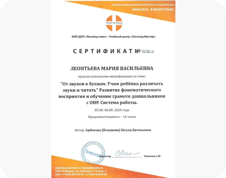 - Курс повышения квалификации АНО ДПО Логопед плюс " Развитие фонематического восприятия и обучение грамоте дошкольников с ОНР"