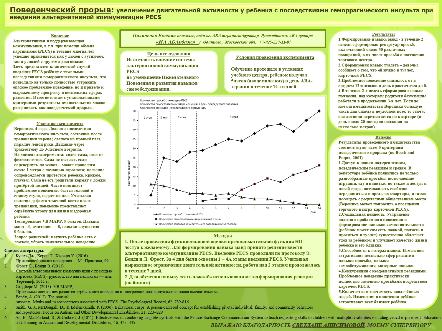 PECS практически полностью заместил проблемное поведение в виде ударов головой о различные поверхности, представляющего серьезную угрозу здоровью ребенка;